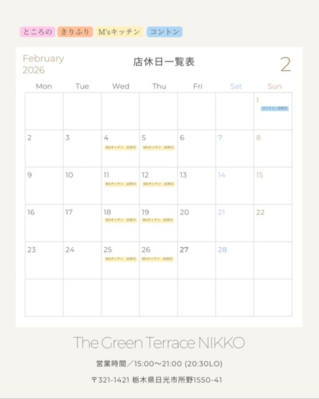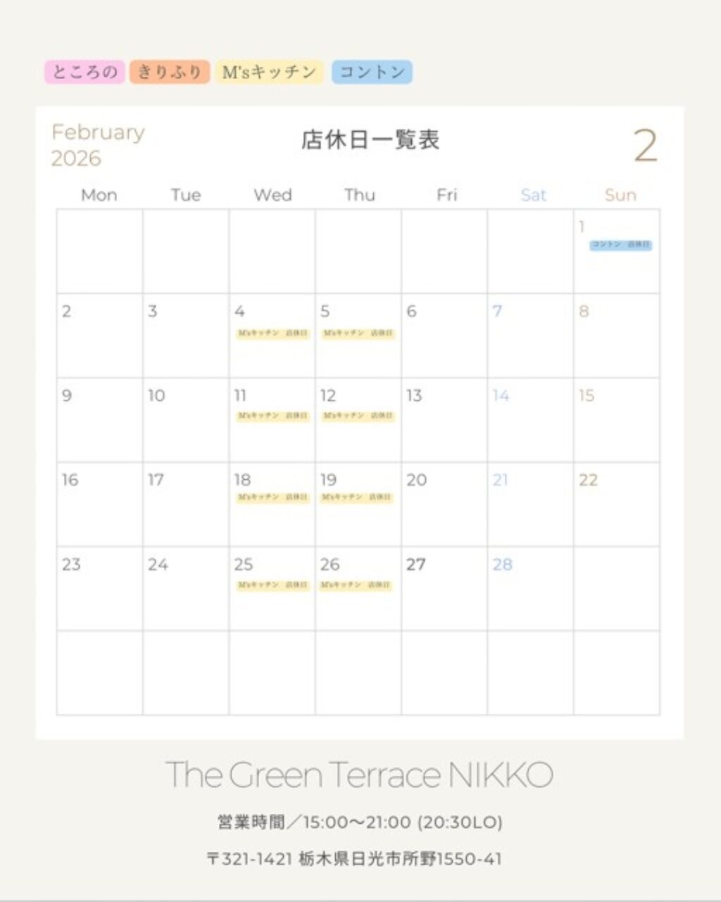 グリーンテラス日光の各店舗2月の店休日をお知らせいたします。